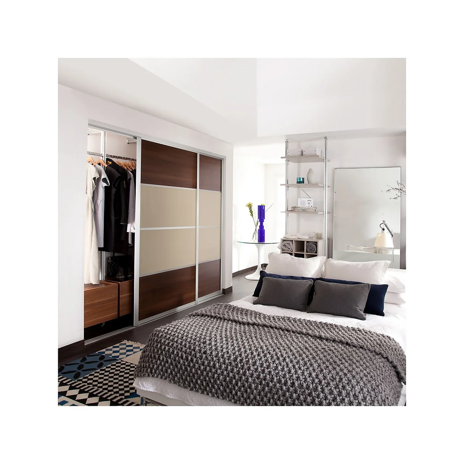 The Ellipse sliding wardrobe doors are finished in an elegant curved silver aluminium frame, and are available in a wide range of panel designs and colour finishes. The 4 panel doors give you greater flexibility to choose your own design and make a stunning contemporary look in your room.