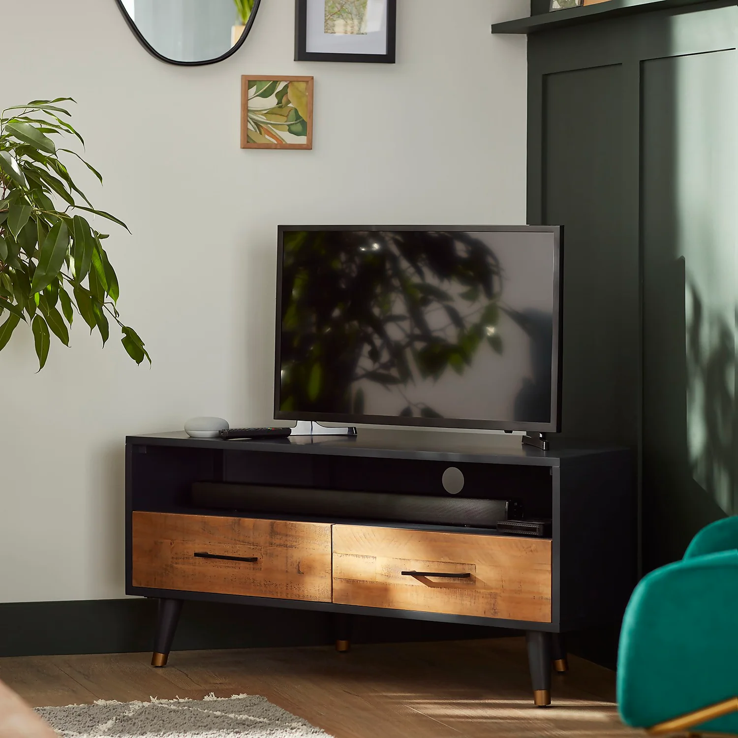 Every inch industrial. Franklin combines a mix of materials from solid pine to brushed brass feet. Our Franklin corner TV stand features a spacious tabletop for your screen. There’s storage space in abundance with 2 drawers to conceal lounge clutter. The large open shelf is perfect for popping on your media boxes and games consoles. It features a corner design that is ideal for smaller rooms. The Franklin is stood from the ground on striking splayed legs and its brushed brass feet make this one attention-grabbing unit.
