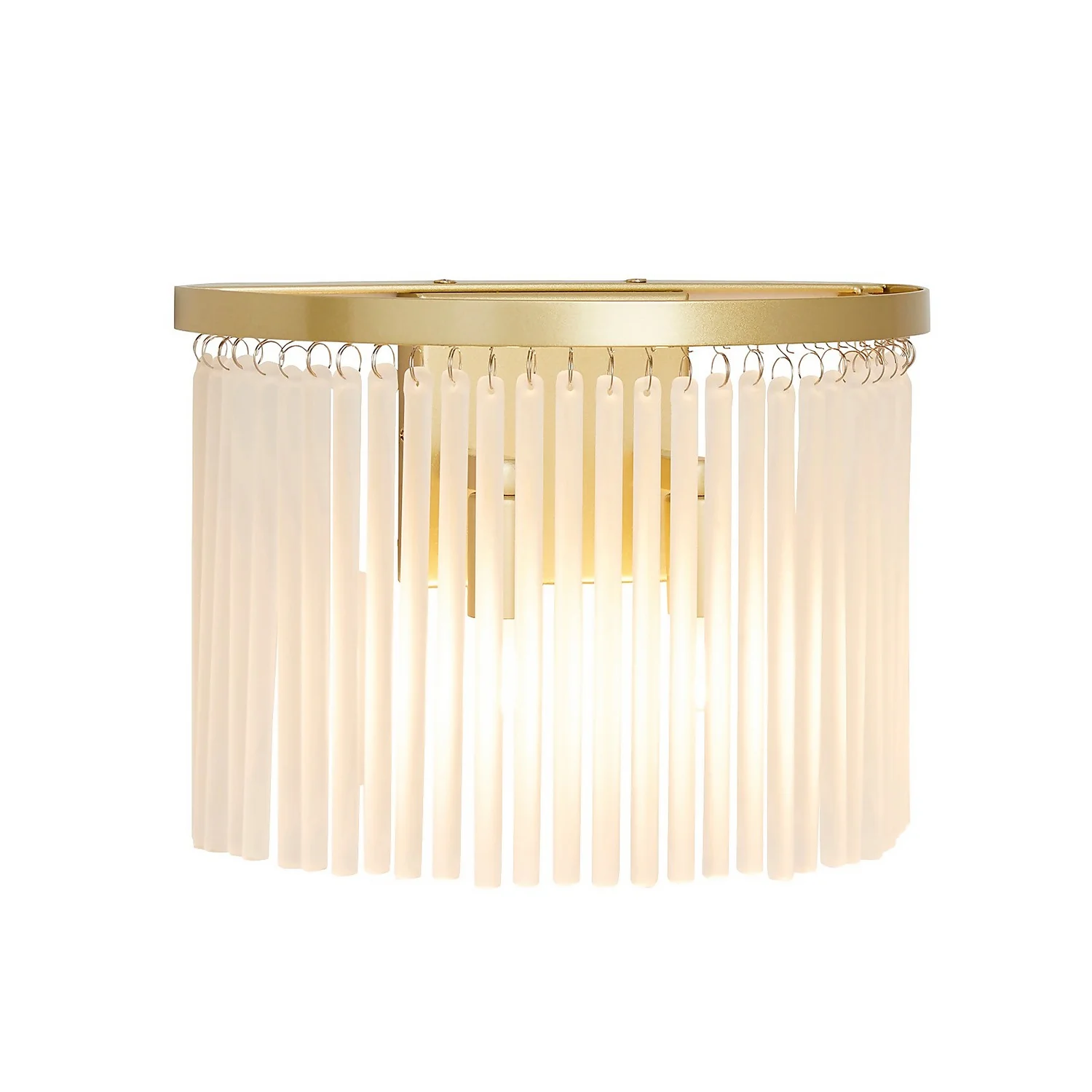 This beautiful brass painted wall light will bring a touch of glamour to any interior space. Featuring frosted glass rods, this light is sure to add a luxurious element to your home decor. A statement piece that fuses 1920’s art deco styling with architectural structures. Also available in three tier pendant, single tier pendant and easy fit shade.