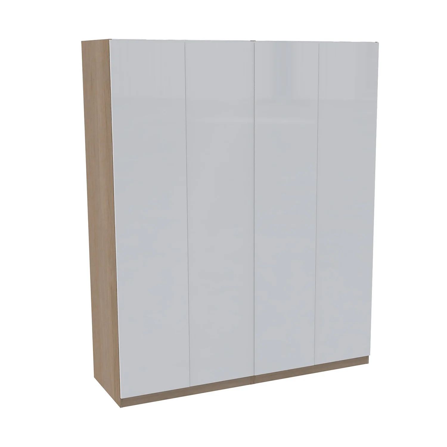 The House Beautiful range is exclusive to Homebase and offers a selection of different finishes and storage configurations to suit your needs. With a range of carcass colours and contrasting door designs, you can select the look to fit your bedroom aesthetic. This four door wardrobe (2 x double units) features an oak effect carcass and beautiful gloss white slab doors for a modern sleek look. The wardrobe features premium soft close clip-on Blum hinges, two shelves and two hanging rails. You can customise your wardrobe with our additional internal storage options (available separately) including internal drawers, shelves, dividing shelves and extra hanging rails. Choose your handles from our range of both traditional and modern to suit your desired look.