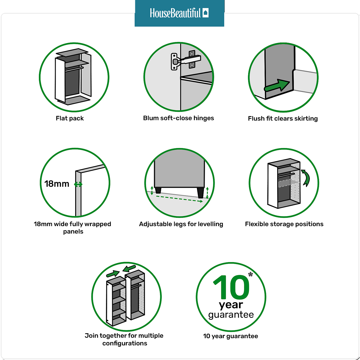 The House Beautiful range is exclusive to Homebase and offers a selection of different finishes and storage configurations to suit your needs. With a range of carcass colours and contrasting door designs, you can select the look to fit your bedroom aesthetic. The House Beautiful range now includes the fully fitted look with this combination pack which includes the wardrobe, end panels, plinth and cornice, meaning you can complete your bedroom with a luxury look. Coordinating chests of drawers are also available separately.