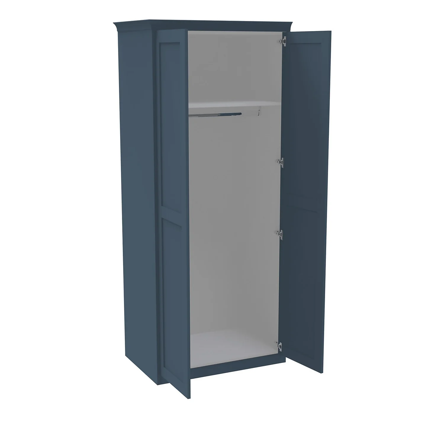 - A fitted look is achieved by using clad on panels, plinth and cornice which are all included with this wardrobe. All the elements that clad the internal white carcass (clad on panels, plinth and cornice) are a perfect match to the matt navy blue shaker door