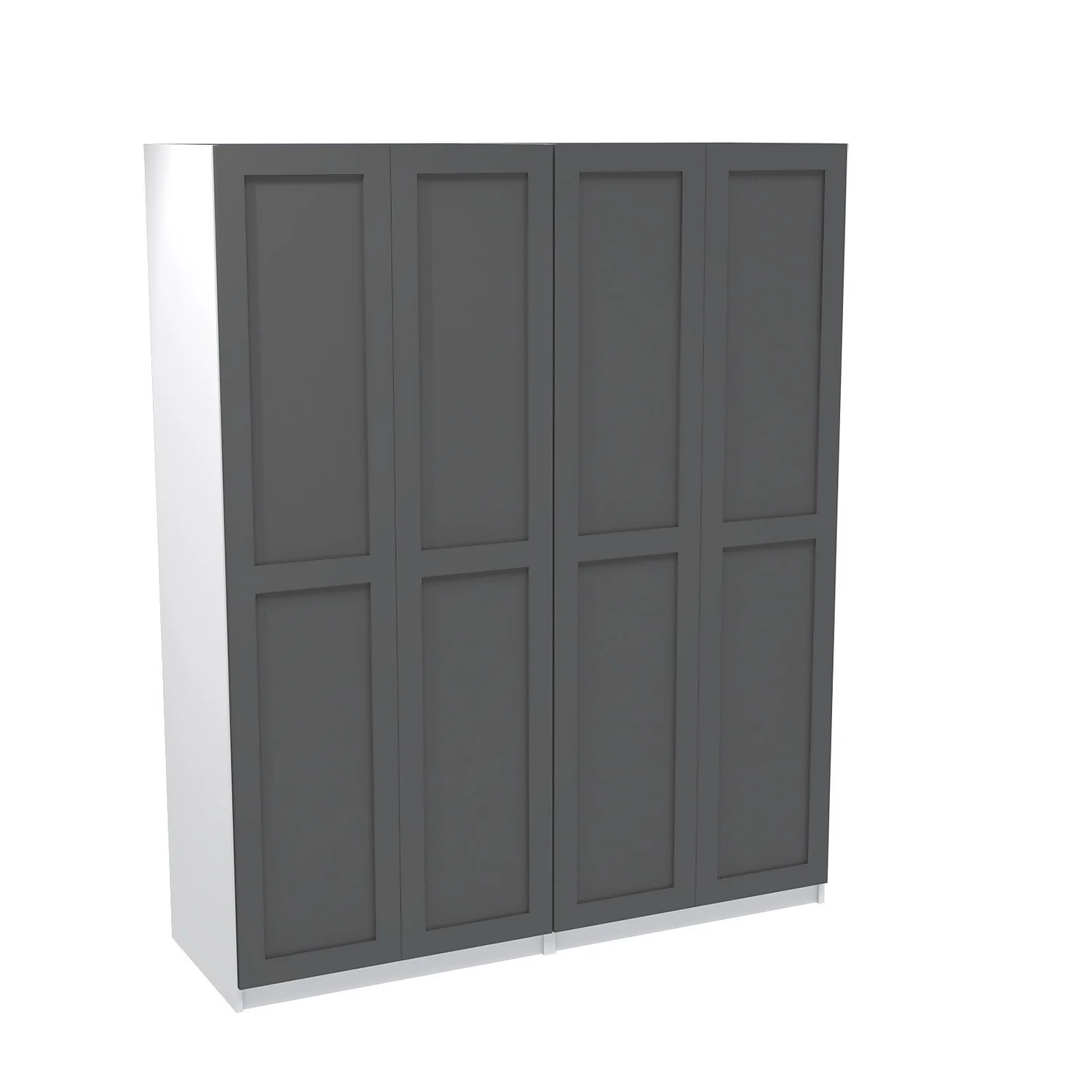 The House Beautiful range is exclusive to Homebase and offers a selection of different finishes and storage configurations to suit your needs. With a range of carcass colours and contrasting door designs, you can select the look to fit your bedroom aesthetic. This four door wardrobe (2 x double units) features a white carcass and beautiful shaker doors finished in a luxurious matt carbon grey. The wardrobe features premium soft close clip-on Blum hinges, two shelves and two hanging rails. You can customise your wardrobe with our additional internal storage options (available separately) including internal drawers, shelves, dividing shelves and extra hanging rails. Choose your handles from our range of both traditional and modern to suit your desired look.
