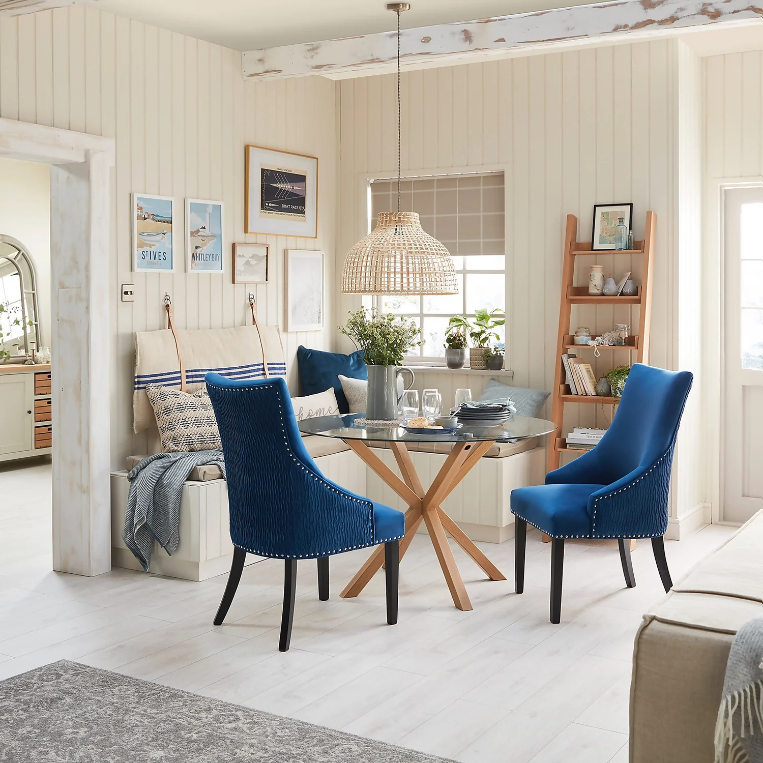 Enjoy leisurely lunches at the Ludlow. This stunning table would make a trendy addition to your home. Its chic cross-leg base offers stand-out style that will set your dining room apart. The round tabletop is made from toughened glass so it’s perfect for busy family life. The strong metal frame is complete with a warming oak effect finish. Ludlow offers the perfect place to spend time with your nearest and dearest.