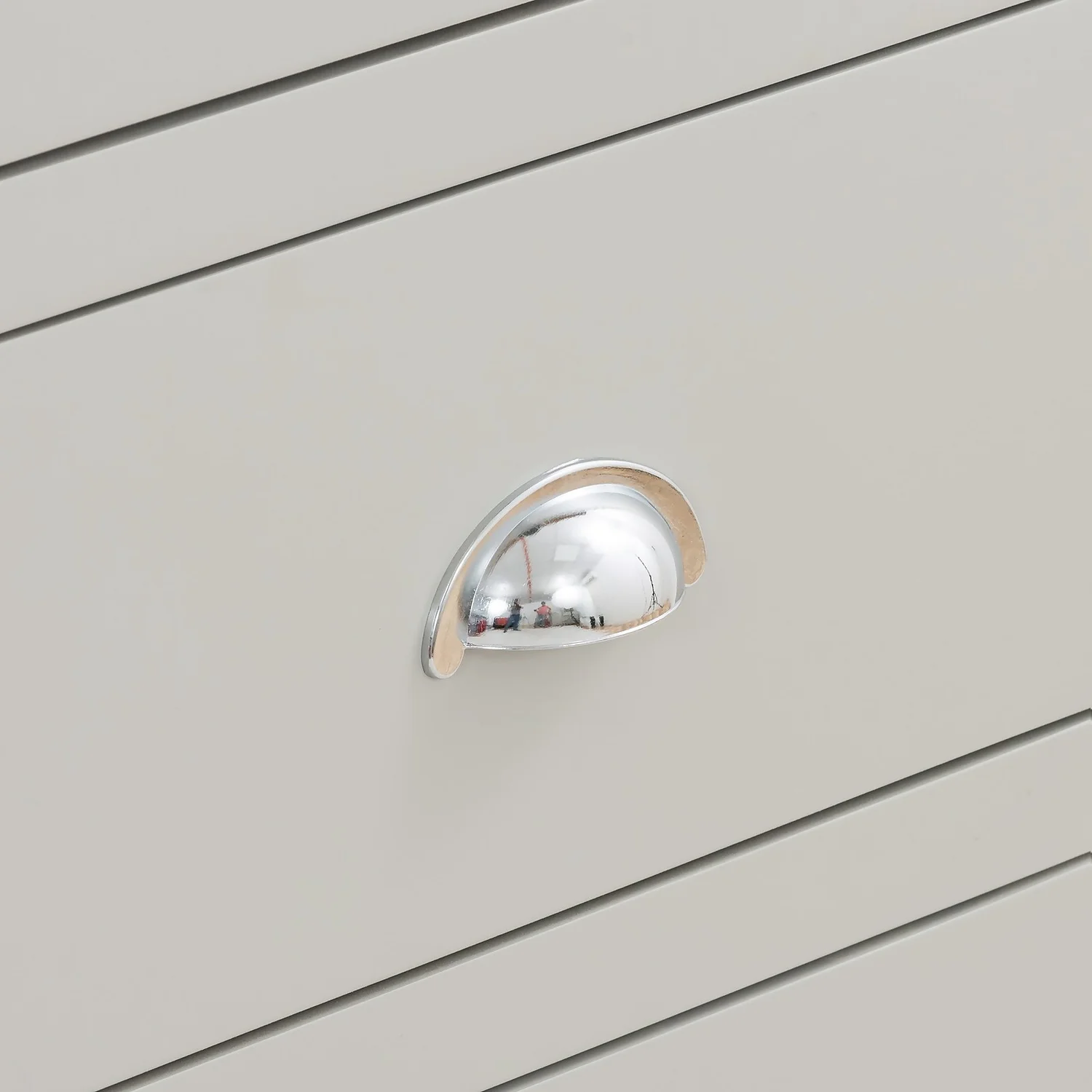 We’ve worked hard to make Norbury our most family-friendly range yet. We’ve softened all the edges, even the legs, so there are no sharp corners here. This compact collection has a small footprint, but its clever design doesn’t compromise on storage space. Meet our oak Norbury 5 drawer chest. With its classic oak top and cup handles, it has a charming timeless design but with a modern painted grey finish. Stow away your foldable clothes in the 3 wide drawers then use the top 2 drawers for your socks and smalls. The top surface also comes in handy for showcasing some of your favourite trinkets. This chest of drawers is a bedroom must-have.